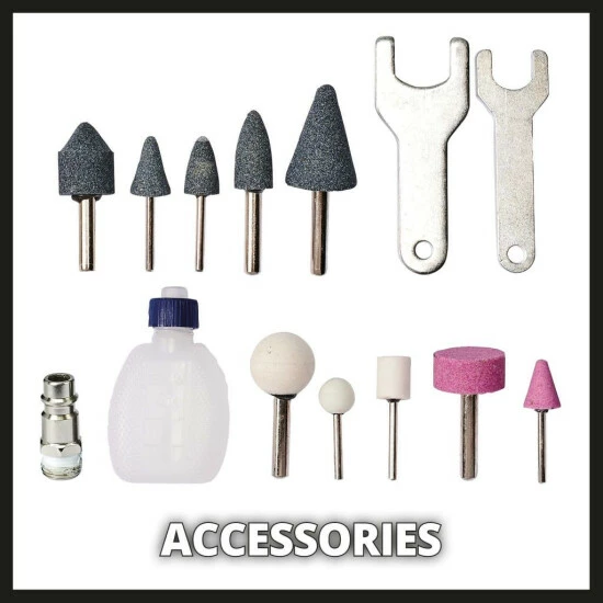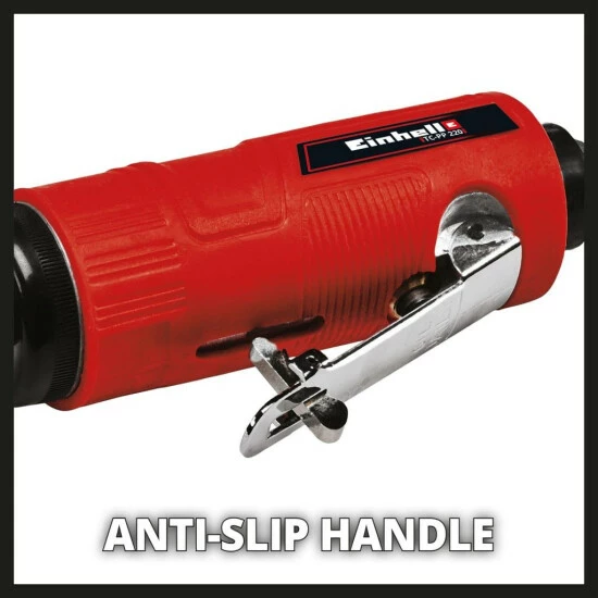 Dieser TC-PP 220 Druckluft-Stabschleifer von Einhell ist für professionelles Schleifen, Polieren, Gravieren und Entgraten rund um das Haus bzw. in der Garage oder Werkstatt bestimmt. Mit einer Drehzahl von bis zu 22.000 U/min ist dieses leistungsstarke Präzisionswerkzeug ein großer Helfer bei Schleifarbeiten. Beste Performance liefert er ab einem Schlauchinnendurchmesser von 9 mm. 10 Schleifstifte sind im Lieferumfang auch enthalten, damit Sie mit der Arbeit an einer großen Vielfalt von Materialien und Formen sofort beginnen können. Der schwingungsdämpfende, rutschfeste Griff des Schleifers sorgt für eine komfortable und ergonomische Handhabung. Gleichzeitig verhindert der Sicherheitsabzugshebel ein ungewolltes Starten. Dieser Druckluft-Stabschleifer ist für die Einhandbedienung geeignet und wird samt einem Komplettset aus Schleifsteinen und weiteren Zubehörteilen in einem robusten Aufbewahrungskoffer geliefert.
